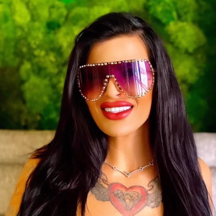These gorgeous sunglasses will make everyone stop to look at you! Light purple with gold lenses with Swarovski crystals. Exclusive at Urock Couture!